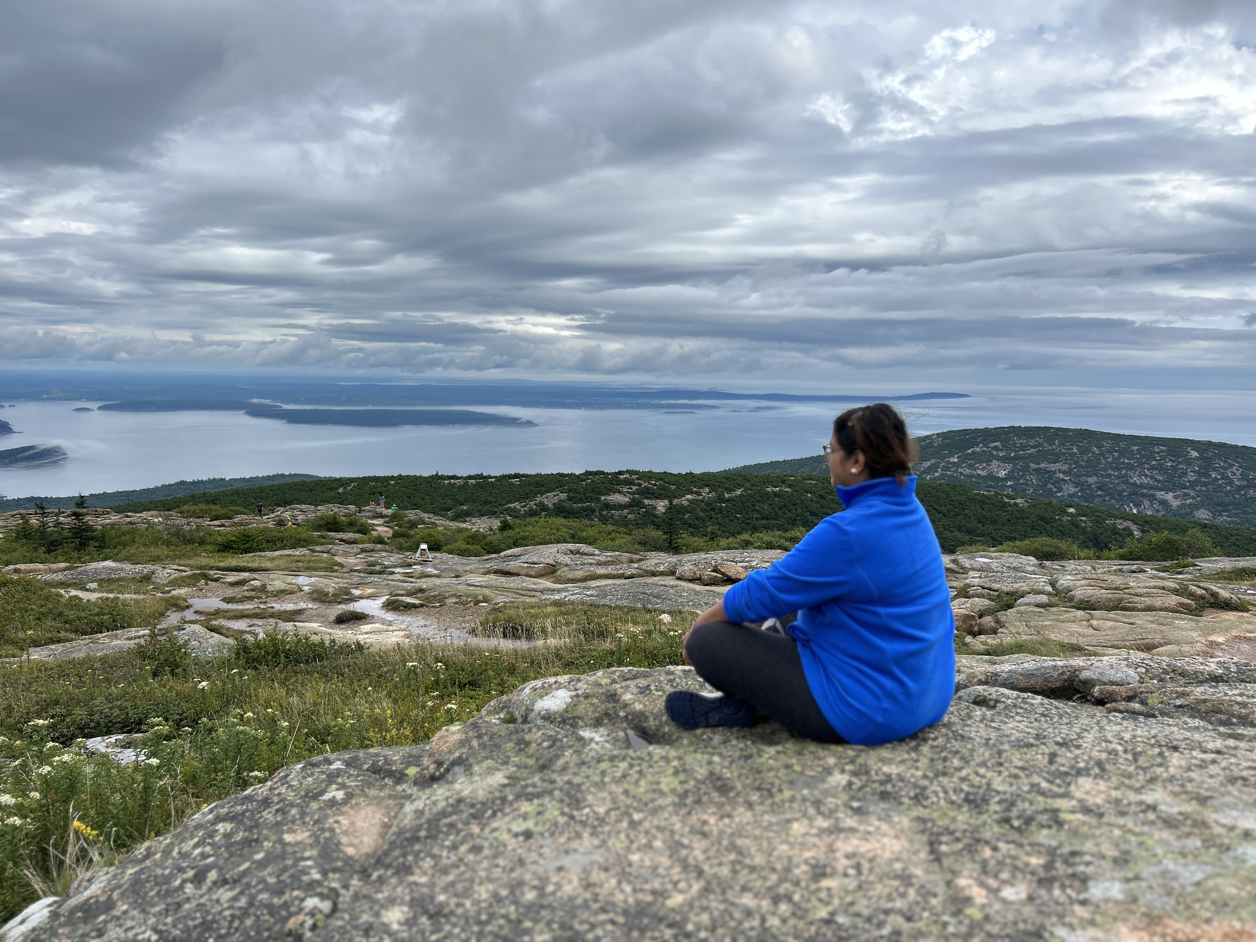 Priya looking out over the waters from Cadillac Mountain at Acadia National Park in August 2023.