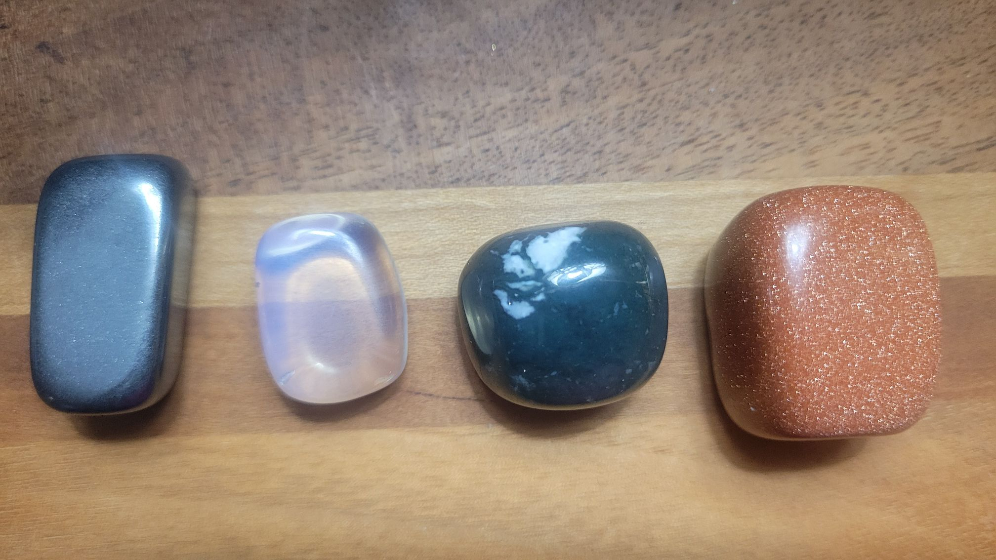 Left to Right: Hematite (grounding, balance), Opalite (healing, joy), Moss Agate (growth, abundance, peace), Red Goldstone (uplifting, confidence).