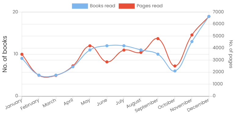 - I struggled with focus this year—not only because of the aforementioned chaos, but also because I was pushing through Brandon Sanderson’s Wind and Truth, which took me a year to read. From January 20th to about May 1st I read about 5 books a month (which for someone who manages to do about 10-15/month this was a shocking statistic to see).